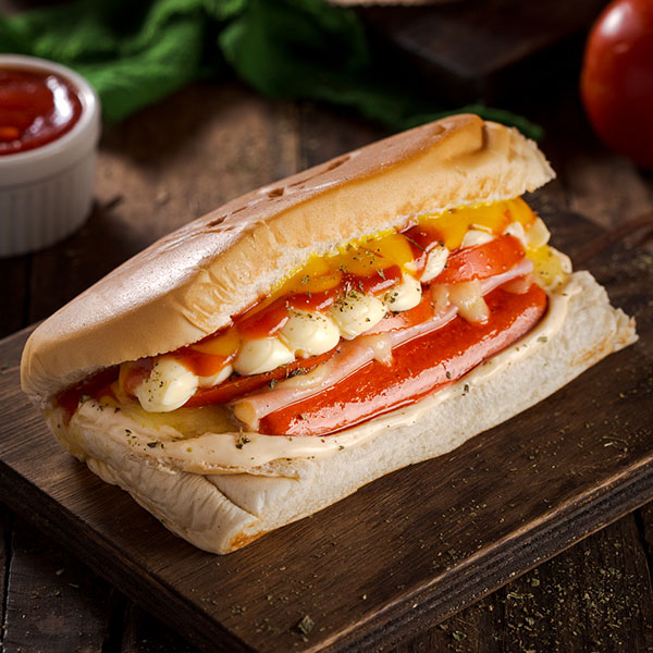 Pão, salsicha, queijo muçarela, presunto, requeijão, tomate, oregano, azeite e maionese.
